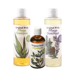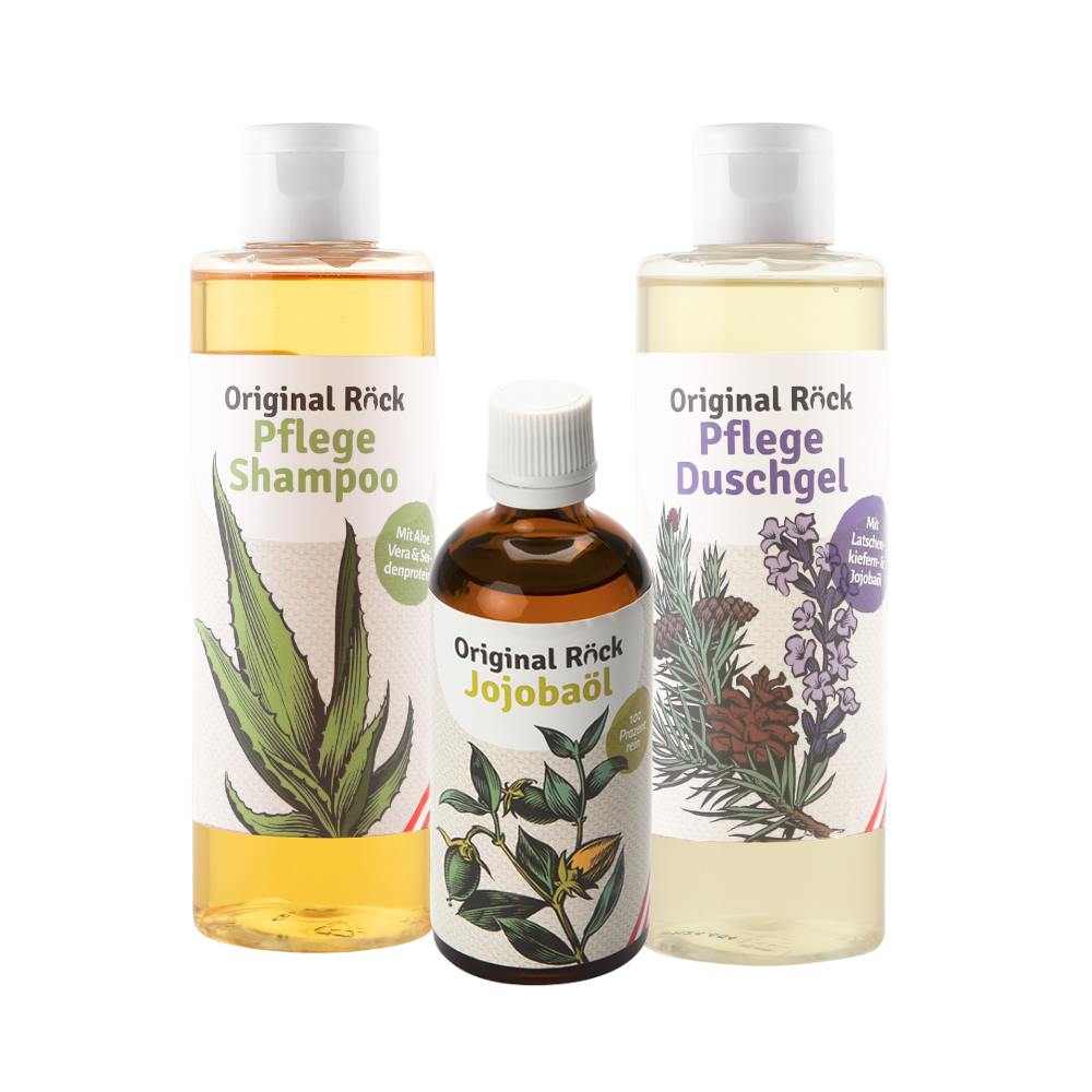 Das Pflegeset für Haut & Haar: Das sanfte Röck Pflegeshampoo mit Aloe Vera sorgt für Glanz und Kraft, das Jojobaöl pflegt intensiv und spendet Feuchtigkeit, und das Latschenkiefer Pflegeduschgel erfrischt und belebt die Sinne.