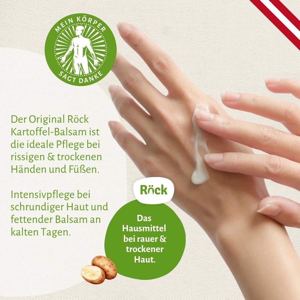 Der Röck Kartoffel Balsam ist ausschließlich zur äußerlichen Anwendung bestimmt. Eine kleine Menge auf die gereinigte Haut (z. B. Hände, Ellenbogen, Füße) auftragen und sanft einmassieren, bis der Balsam vollständig eingezogen ist.