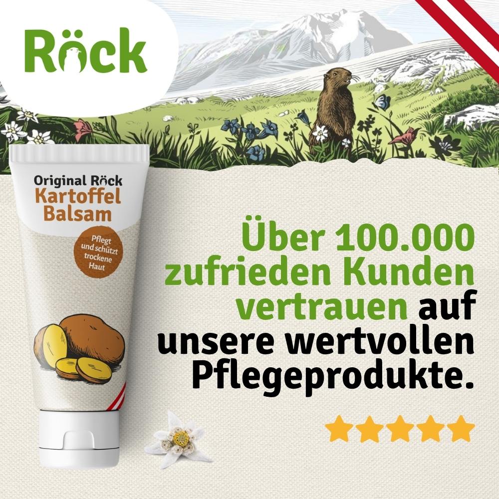 Der Original Röck Kartoffel Balsam ist die ideale Pflege für trockene, raue und strapazierte Haut. Er versorgt die Haut intensiv mit Feuchtigkeit, macht sie geschmeidig und schützt zuverlässig vor dem Austrocknen – perfekt für Hände und Füße, die täglich viel leisten müssen.